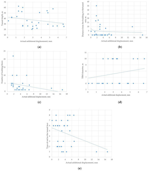 In previous work [,,,], we presented the results of the geotechnical monitoring of the settlement of buildings and structures in the area of influence of the tunneling works. Here, an additional study of the well-known data was conducted to identify the relationship between the supplementary displacements and the following factors: the depth and distance in the plan from the tunnel axis to the monitored object, the class and type of the face soil, the TBM diameter, and the loading that comes from the buildings and structures affected by the works.