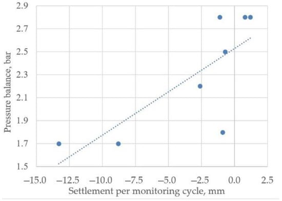 The evaluation of the effect of the pressure balance values, presented in Table 1, on the additional vertical displacements was made calculated to identify regularities. The dependence between the settlement and the pressure balance is shown in Figure 5. The Pearson’s correlation coefficient [] was equal to 0.77 between the earth balance and the benchmark settlement during one monitoring cycle. This means there was a close linear relationship interpreted as a strong correlation. Hence, the coefficient of determination [] was 0.60. This parameter shows the percentage of sampling explainable by the influence of the studied factors. According to the Chaddock scale [], the coefficient value indicated an evident relationship between the parameters. Using the Student’s t-test [], the value of the correlation coefficient was recognized as significant in 95% of cases.