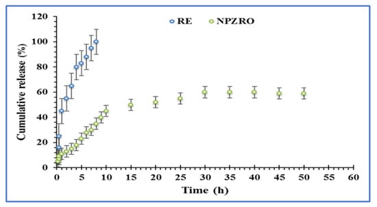 2.5. NPZRO’s Entrapment Efficacy (EE%) and Release
