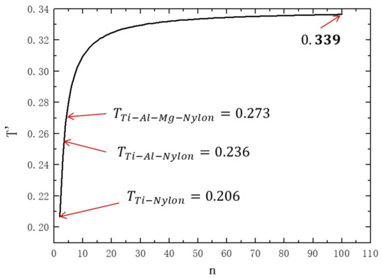 Assuming that the surface material of the wave-impedance gradient material is titanium alloy and the back material is nylon, the constant and are determined. The total transmission coefficient of Ti-Ny is 0.206, that of Ti-Al-Ny is 0.236, and that of Ti-Al-Mg-Ny is 0.273. With the increase in the number of layers , the total transmission coefficient approaches the maximum value of 0.339, as shown in Figure 2.