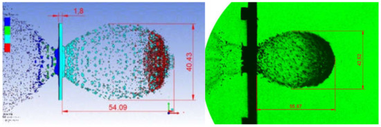 Figure 3 shows the comparison of the numerical-simulation results and experimental photographs under the same working conditions. The deviation between the numerical simulation results and the experimental results of the debris-cloud-head-extension-distance gradient material was about 3.2%. The deviation between the numerical-simulation results and the experimental results was about 4.9%. The above comparison shows that the selected calculation model and parameters are reasonable.