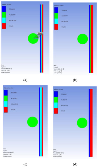 Calculation model for working conditions 1–4: (a) Ti-Al-Mg-Ny protective screen; (b) Ti-Al-Ny protective screen; (c) Ti-Mg-Ny protective screen; (d) Ti-Ny protective screen.