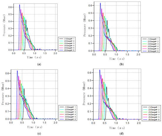 Figure 5 shows the impact-wave-amplitude changes at different positions in the projectile under the impact of four calculation models at 5 km/s. It can be seen from the figure that the shock wave of the projectile started at the contact surface of the projectile target, and the amplitude gradually attenuated with the increase in the propagation distance.