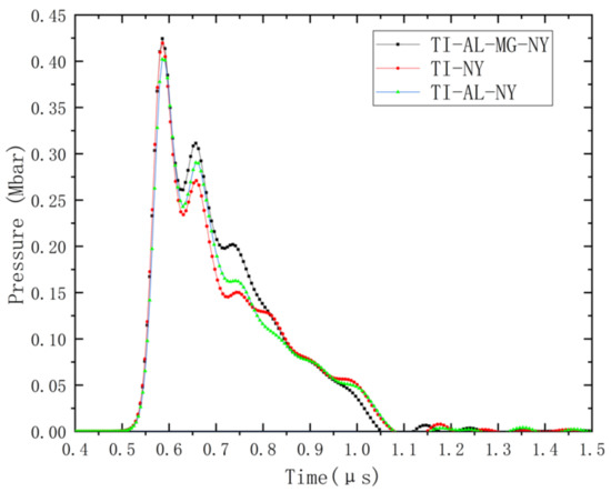In order to accurately compare the impact of the continuous gradient change on the shock-wave amplitude, Figure 6 shows the corresponding projectile shock waves of the Ti-Ny, Ti-Al-Ny, and Ti-Al-Mg-Ny shielding materials at the impact speed of 5 km/s. It can be seen that the initial pressure of the shock wave corresponding to the three materials was essentially the same, because the surface material impacted by the projectile target was titanium alloy. The shock-wave amplitude of the three materials decreased with the increase in time, and the decreasing amplitude was Ti-Ny > Ti-Al-Ny > Ti-Al-Mg-Ny, which indicated that the attenuation amplitude of the shock wave in the projectile decreased obviously with the continuous change in the wave impedance, which was consistent with the theoretical analysis.