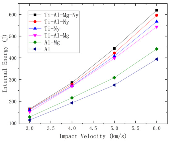 In the process of the hypervelocity impact, part of the kinetic energy of the projectile is converted into the kinetic energy of the debris cloud, and the other part is converted into the internal energy of the material. The internal-energy-conversion ability of the protective-screen material is an important criterion for judging the performance of the protective material. The higher the internal-energy conversion, the better the protective performance. Therefore, the analysis of the internal-energy-conversion characteristics during the interaction between the projectile and the wave-impedance gradient material can be used to effectively judge whether the continuous change in the wave impedance is conducive to improvements in the protection ability; it can also be used to examine the influence of the surface-material wave impedance and the total gradient attenuation value on the protection performance, so as to guide the design of the wave-impedance gradient material. Table 5 shows the corresponding converted internal energy of the five shielding materials, Ti-Ny, Ti-Al-Ny, Ti-Al-Mg-Ny, Ti-Al-Mg, and Al-Mg, under different impact speeds.