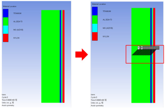 In this paper, the AUTODYN dynamic simulation program was used. In order to expand the variation range of the simulated wave-impedance gradient as fully as possible, titanium alloy, aluminum alloy, magnesium alloy, and nylon were selected as the commonly used engineering-protection materials for the numerical simulation. A 2D model was used for the model verification, and the calculation speed and accuracy were considered. The particle size was 0.1 mm.