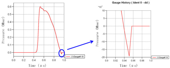 The judgment of spallation breaking can be performed by analyzing the pressure-time-history curve of the typical observation points. A positive value in the time-history curve indicates that the material bears the compressive stress, and a negative value indicates that the material bears the tensile stress. When the tensile stress is greater than the set spallation-breaking strength, the material undergoes spallation breaking, as shown in Figure 9.