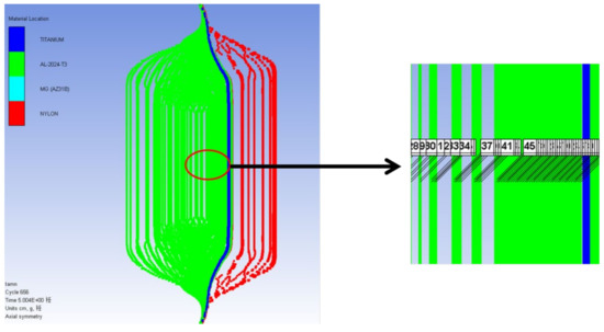 - Titanium alloy, aluminum alloy, magnesium alloy, and nylon were selected to establish the numerical-simulation model. The numerical-simulation analysis showed that the decreasing amplitude of the shock wave with time was Ti-Ny > Ti-Al-Ny > Ti-Al-Mg-Ny, the transformed internal energy was Ti-Al-Mg-Ny > Ti-Al-Ny > Ti-Ny, and the projectile-breaking area was Ti-Al-Mg-Ny > Ti-Al-Ny > Ti-Ny.