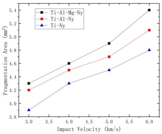 It can be seen from Figure 11 that the fragmentation area of the projectile corresponding to the three materials increased with the increase in the impact speed, because the higher the speed, the greater the shock-wave strength and the greater the fragmentation of the projectile. At the same speed, the fragmentation area of the projectile was Ti-Al-Mg-Ny > Ti-Al-Ny > Ti-Ny. It can be seen that the continuous change in the gradient obviously increased the tensile fragmentation area of the projectile, which was conducive to the diffusion of the projectile fragments, thus improving the spatial-diffusion ability of the kinetic energy.