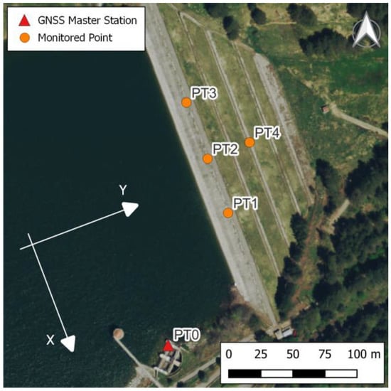 This section presents the real case of dam monitoring based on GNSS techniques and is taken as a reference to exemplify the methodological approach for the analysis and interpretation of the displacement time series logged by the GNSS monitoring system. Two subsections are reported. The first one focuses on the description of the monitored structure, its characteristics and the installed GNSS monitoring equipment. For security and privacy reasons, site and structure will be described in a general way, and any information that could potentially lead to identifying the location and/or the responsible personnel/organization/company of the dam will be omitted. The second subsection deals with the processing required to filter the raw time series for the subsequent displacement interpretation, with particular reference to a possible practical implementation in the framework of an early warning system.