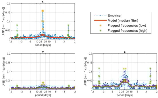 of the ASD was determined by applying a moving median filter. The ratio between the empirical and filtered ASDs