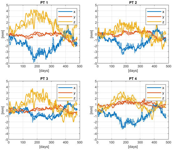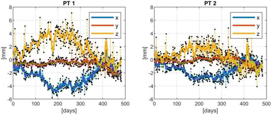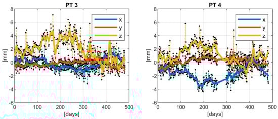 The time series of the daily estimated displacements of each point along the three local XYZ axes needed to be filtered to properly manage the observation noise [