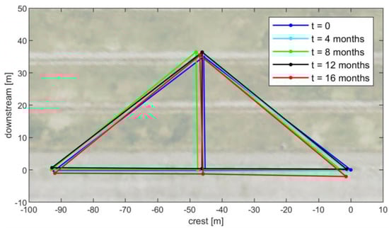 43], thus modeling the signal in time as a stationary random process. A requirement for such an approach is that the signal to be treated is zero-mean, which is not guaranteed in the case of time series regarding point displacements. To fulfill this requirement, a remove–compute–restore scheme was adopted, where the first step consists of removing a deterministic trend from the observed data by modeling it as the sum of a polynomial and a periodical component. After this stage, the observed residual displacements were filtered by collocation, and finally, the deterministic trend was added back to the filtered time series to estimate the displacement.