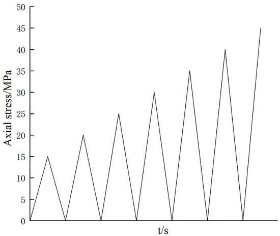 In order to explore the energy evolution law and damage characteristics of the whole process of rock damage, uniaxial compression tests and cyclic loading and unloading tests were conducted. This test uses the RMT-150C rock mechanics test system to load the specimens, as shown in Figure 2. This mechanical system can load the specimen automatically; after input, the rock information and loading command, the loading is performed automatically. The specimen is preloaded first, and the press will stop automatically when it comes into contact with the rock sample, which makes it easy to record the real loading time and avoids the rock being crushed before the test; after the specimen is destroyed, the press can unload automatically and return to the initial state, which improves the test efficiency. The test adopts stress control mode, and the loading system has 12 loading rates, in the range of 0.001 to 100 KN/S. In this study, three loading rates of 0.2 KN/S, 0.5 KN/S, and 1 KN/S were selected for uniaxial compression, as well as uniaxial acceleration and deceleration cycle, tests. The loading path is shown in Figure 3.