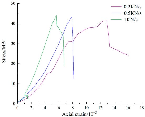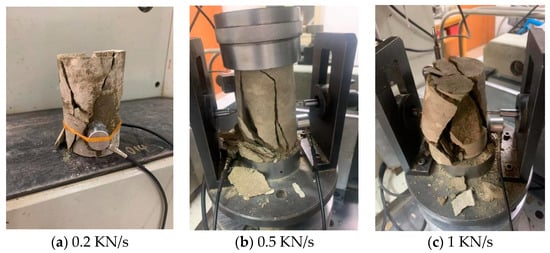 At three different loading rates, the uniaxial compressive stress–strain curves and post-damage morphology of sandstone are shown in Figure 4 and Figure 5. The physical and mechanical parameters are shown in Table 1. It can be seen that, although the stress–strain curves obtained at different loading rates have slightly different patterns, the sandstone undergoes four processes, from intact to damaged: first it is compacted, then it undergoes elastic and plastic deformation. The rock was finally destroyed. When the test was conducted with a loading rate of 0.2 KN/S, the average value of peak stress of sandstone was 41.17 MPa; the average value of peak strain was 0.0129, and the average value of elastic modulus was 35.42 GPa. The damage form was shear damage, with two oblique shear surfaces through the specimen, a small number of large-scale rock pieces along the shear surface, accompanied by a continuous “friction” sound. When the loading rate was increased from 0.2 to 0.5 KN/S, the average value of peak stress in sandstone was 42.27 MPa, with an increase of 0.25%; the average value of peak strain was 0.00787, with a decrease of 38.99%, and the average value of elastic modulus was 37.44 GPa. The damage form was mainly in tension shear, accompanied by splitting damage, multiple penetrating fracture surfaces, and along the fracture surface. The damage form is mainly in tension shear, accompanied by splitting damage, with multiple penetration fracture surfaces; along the fracture surface appears a large number of medium-scale rock blocks, which are accompanied by continuous bursting sound. The damage form is mainly in tension shear, accompanied by splitting damage, multiple penetrating rupture surfaces, and multiple medium-scale rock blocks along the rupture surface, which are accompanied by a continuous bursting sound. When the loading rate was increased from 0.5 to 1 KN/S, the average value of peak stress of sandstone was 44.45 MPa, with an increase of 5.16. The average value of peak strain was 0.00556, with a decrease of 29.35%, the average value of elastic modulus was 46.19 GPa, and the damage form was mainly in the form of splitting blocks, with multiple penetrating splitting surfaces; a large number of small rock blocks formed along the splitting surface. The damage is mainly in the form of splitting blocks, with multiple penetrating cleavage surfaces, and a large number of small rock pieces formed along the cleavage surface, with a continuous bursting sound, loud noise, and small amount of rock chips flying out during the damage.