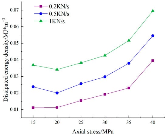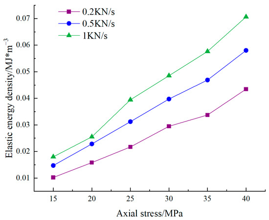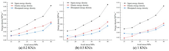 Using the above energy calculation method, the rock energy densities for different stages of the cyclic loading and unloading test were obtained. The energy density obtained from the calculation is plotted in Figure 6. It can be seen from the graph that, under the three loading rates, before the peak stress, the input and elastic energy densities all grow nonlinearly with the increase of stress, and the input energy density grows rapidly, followed by the elastic energy density. The dissipative energy density is high in the first cycle and decreases slightly in the second cycle; then, this trend shows a non-linear pattern, and the growth rate is the slowest among the three energies. The rocks exhibit different deformation characteristics under different stress states, and similarly, their energy evolution law has different characteristics in different deformation stages. In the initial loading stage, corresponding to the rock compacting stage, the accumulated elastic energy in the rock increases slowly, and the dissipation energy caused by the friction of the closure of the original microcracks and misalignment between the rock masses is larger than the accumulated elastic energy, and the growth of all three types of energy is slow in this stage. In the elastic deformation stage, the rock specimen continuously absorbs energy, and most of the input energy is converted into elastic energy. A small part is used for the formation and expansion of microcracks, and the energy grows approximately linearly. In the plastic stage, more and more input energy is dissipated in the formation, expansion, and nucleation of microcracks inside the rock. The accumulated elastic energy is dissipated in the form of crack surface energy, acoustic emission, and other energy. Near the peak stress stage, the three energy densities show an accelerated growth trend. The elastic energy of the rock specimen reaches its maximum at the end of the plastic stage, which is the peak stress stage. The energy evolution directly reflects the inherent properties of the rock; it can be inferred that the elastic energy is the main driving force for the destruction of the rock specimen. The variation of the elastic energy density indicates that the rock has a certain energy storage limit, which is related to the lithology of the rock and its stress state. The number, size, and distribution of the initial microcracks are the main factors affecting the energy storage limit of the rock.