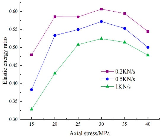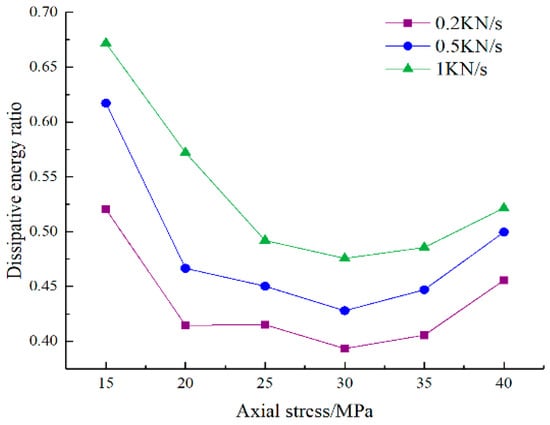 It has been shown that rock energy evolution has a strong rate correlation [26,27,28,29]. However, there is no uniform understanding of the variation of various forms of energy with the loading rate, so it is necessary to make an analysis of the loading rate effect of that. As Figure 8 and Figure 9 represent, at different loading rates, the evolution law of elastic energy and dissipative energy with axial stress is similar, which has been analyzed in the previous section. The elastic energy increases with the increase of the loading rate. The increase of elastic energy with stress at the beginning of loading is not obvious. With the increase of axial stress, the loading rate effect of elastic energy is gradually amplified. Dissipation energy also increases with the increase of loading rate. This is because the increase of loading rate will lead to the increase of peak stress; that is, the rock strength will increase, so the input energy will also increase, and the energy allocated to elastic energy and dissipation energy will be increased accordingly. The distribution ratio of elastic energy and dissipated energy under different loading rates is shown in Figure 10 and Figure 11. In different deformation stages, the percentage of elastic energy decreases with the increase of loading rate; the percentage of dissipated energy increases with the increase of loading rate. The more energy that is dissipated during the deformation of the rock, the more microcracks will be produced and fracture surfaces will be formed; at the same time, more fragments appear, and the fragment sizes become smaller. This explains the phenomenon that, the larger the loading rate, the more fracture surfaces, more fragments, and smaller the scale after damage.