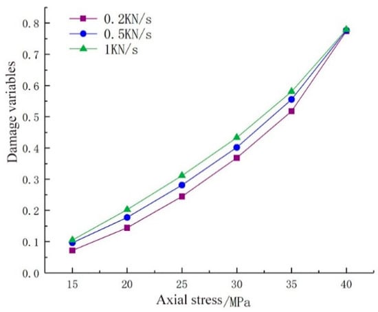 Under the three loading rates, the variation of damage variables with axial stress of the rock in cyclic loading and unloading tests can be calculated, as shown in Figure 12. Under the action of cyclic loading and unloading, the damage variation curve of the rock is the “weakly concave” type, with the increase of axial stress, the damage variation gradually increases, and the rate of change also gradually increased. When near failure, the change rate of the damage variable with stress is the largest, but there is no obvious mutation.