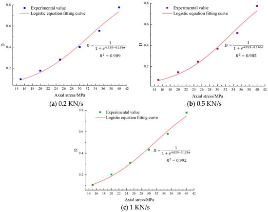 where is the damage variable; denotes the accumulated dissipation energy at a given stress state of ; is the sum of the dissipated energy generated during the whole deformation process. is to be 0.154, 0.246, and 0.350 MJ.m−3 at 0.2, 0.5, and 1 KN/s loading rates, respectively (The peak point dissipation energy is calculated by the equation ).