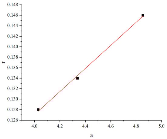 The data from the test were fitted with Equation (5). Its fitting curve and equation can be acquired. As can be seen from Figure 13, the fitting equation has high accuracy, and the equation can well-describe the rock damage evolution process in the prepeak deformation stage of the rock. It can be seen that, with the increase of loading rate, the initial damage parameter a keeps decreasing; that is, the initial damage degree keeps increasing. As shown in Figure 14, the endogenous growth rate of damage evolution r shows a good linear relationship with the initial damage parameter .