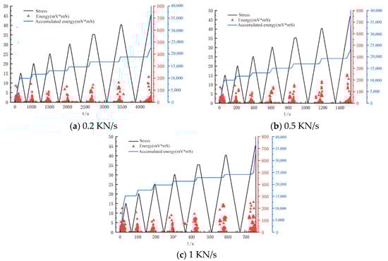 Figure 15 shows the axial stress, energy, and accumulated energy, with time under 0.2, 0.5, and 1 KN/s cyclic loading and unloading conditions.