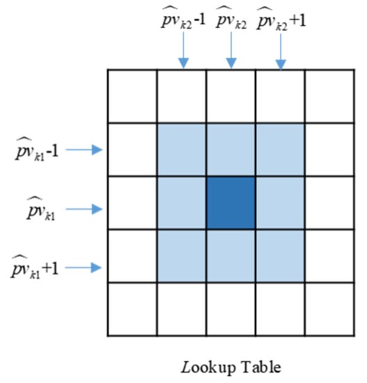 where is the threshold for the feature value match. The above candidates searching process can be implemented by looking for an element where the row index is and the column index is in the lookup table, which greatly improves the efficiency of the GMTV algorithm in searching for matches in the database. In the real star image, some measurement errors will cause feature values to deviate from their true value, so the fuzzy search strategy is adopted in our algorithm to increase robustness; as shown in Figure 5, all elements in the shaded areas whose position index is close to and , namely, where the row index is between − 1 and + 1 and the column index is between − 1 and + 1 simultaneously, are regarded as candidates of the sensor unit.