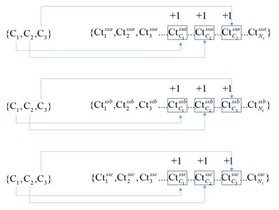A unit in the lookup table constructed by catalog stars whose index number is C1, C2, and C3 in the SAO catalog is a candidate for sensor unit k (built by sensor star a, star b and star c). Then, the counter group belonging to the sensor star is selected, and the value of counters in (, …) corresponding to C1, C2, and C3 add one; as shown in Figure 6, is a counter assigned for guide star C in the counter group belonging to sensor star a (ssa), the same meaning of and . The same operation is completed for the other two counter groups belonging to sensor star b (ssb) and sensor star c (ssc), respectively. The above process is a vote of sensor unit k. We can repeat this voting process until all sensor units are traversed. For each sensor star, the counters’ values in the group are compared with the threshold Thc, and the catalog stars associated with counters whose values are larger than Thc are considered as the candidates for this sensor star.