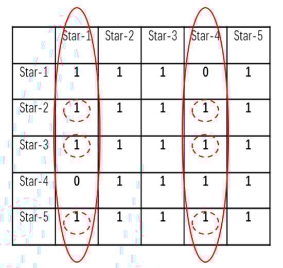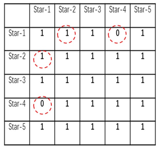 Calculate the angular distance between the candidate stars in the celestial coordinate system, and then compare with the angular distance of the corresponding observed stars in the star sensor coordinate system. If the error between and is less than a tolerance threshold , as described in Equation (5), the element in the corresponding position of the connection matrix is set to 1; otherwise, it is set to 0. The connection matrix is a square matrix of size DD, where D is the number of candidate stars in the initial match. For example, as shown in Figure 7, given that the angular distances between star-1 and star-2 meet the above requirement that the error between and is less than , then the elements in the position index (1, 2) and (2, 1) of the connection matrix are set to 1. Since the angular distances and between star-1 and star-4 do not meet the requirement of Equation (5), the elements in the position index (1, 4) and (4, 1) of the connection matrix are set to 0. It should be noted that the diagonal elements of the connection matrix are all set to 1.