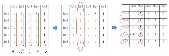In the first part, the elements of the connection matrix are added in the column direction, the column with the largest summation value is determined, and then the candidate stars corresponding to the rows with the element value of 1 in this column are selected to generate the initial largest cluster. For example, as shown in Figure 8, the values after summing the elements in the column direction are 4, 5, 5, 5, 4, and 5, so the second column is of maximum value, and because its elements in rows 1 to 5 are 1, the initial largest clustering is {Star-1, Star-2, Star-3, Star-4, Star-5}.