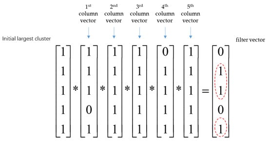 In the second part, the elements in the initial largest cluster are filtered to determine the core cluster. As shown in Figure 9, * is the bitwise multiplication operator; we can bitwise multiply the corresponding column vector in the connection matrix where the initial largest cluster is located with the first column vector, and then bitwise multiply the result of the previous step with the second column vector, then repeat the same operation until the last column vector. Then, a column vector of size D1, defined as the filter vector, is obtained. Next, the candidate stars in the filter vector whose corresponding element value is 1 are selected in the core cluster. For example, the second column vector is bitwise multiplied by each column vector in the connection matrix, and the filter vector is [0 1 1 0 1]’, so the core cluster is {Star-2 Star-3 Star-5}.