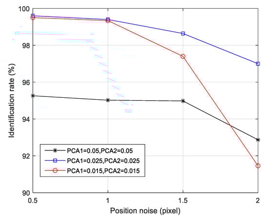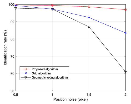 It is obvious that the positional noise deviation increase has little effect on the identification performance of the proposed algorithm compared with the two reference algorithms. When the position noise is 2.0 pixels, the identification rate of the algorithm is 35.92% higher than the geometric voting algorithm and 13.50% higher than the grid algorithm.
