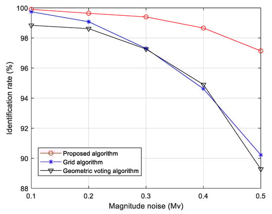 As shown in Figure 13, the proposed algorithm identification rate drops slightly from 99.9% to 97.14% when the standard deviation of magnitude noise gradually grows from 0.1 to 0.5 Mv. In contrast, the other two reference algorithms obtain a lower identification rate with larger noise; the grid algorithm identification rate decreases to 90.22% while the geometric voting algorithm drops sharply to 89.28% with 0.5 Mv magnitude noise, respectively.