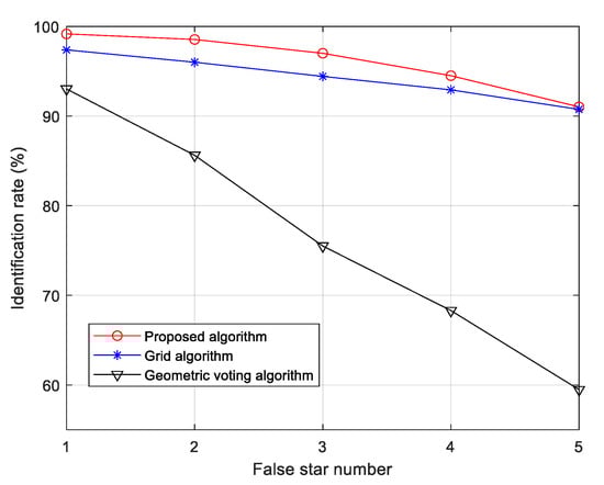 It is obvious that false stars have less influence on the identification performance of the proposed algorithm compared with the other two algorithms. When five false stars are added to the star images, the identification rate of the algorithm is 31.54% higher than the geometric voting algorithm and 0.28% higher than the grid algorithm.