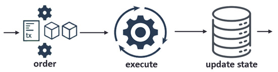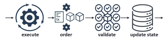Permissionless and permissioned traditional blockchain platforms follow a sequential execution style, whereby transactions in smart contracts are typically executed after consensus or entwined with it and where all participants execute all contracts. The order-execute architecture shown in Figure 3 limits scalability, requires sequential transactions, and endorsement by all peers [23].