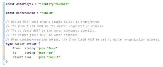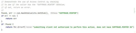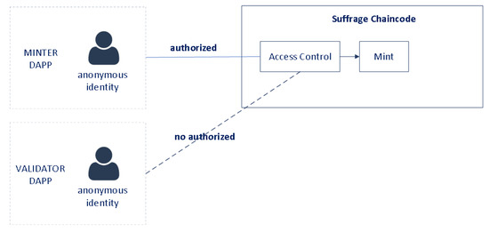 For each user account, an anonymous client identity is issued by the SUFFRAGE CA. When the ballot is issued, the smart contract obtains the client identity that submitted the request, and stores the identity and token ID (random uuid) as the owner in the asset key/value in the public chaincode world state (see Figure 9). Each ballot has access control based on MSP ID (organization name) and affiliation. Only identities from MINTER affiliation of SUFFRAGE organization can mint ballots (see Figure 10).