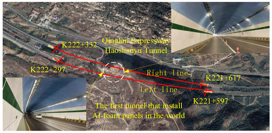 The closed-cell aluminum foam board have great fire resistance and heat insulation performance [27,28,29]. The existing research shows that the thermal conductivity of aluminum foam is very low, and the aluminum foam will not produce toxic and harmful gases at high temperature. So, it can be used as a substitute for the traditional thermal insulation refractory in tunnels. As for the sound absorption properties of closed-cell aluminum foams, it has been preliminarily confirmed [17]. Since the closed-cell aluminum foam board has the properties of fire prevention and sound absorption, it meets the needs of the Haoshanyu Tunnel. The research on the sound absorption performance of closed-cell aluminum foam board in the tunnel was carried out based on the installing project of aluminum foam board in the Haoshanyu Tunnel. The Haoshanyu Tunnel has also become the first highway tunnel in China to install aluminum foam boards.