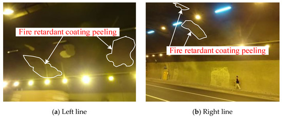 Fire prevention and noise reduction are two of the key points in the tunnel operation. The previous main fire prevention method used in the Haoshanyu Tunnel was spraying fire retardant coatings. However, due to the cool and humid environment in the tunnel and the lack of ventilation, the fire retardant coatings are prone to mildew and discoloration. During the review of the Haoshanyu tunnel, it was found that the average fire retardant coating of the Haoshanyu tunnel peeled off about 6 pcs/80 m2, as shown in Figure 2. Therefore, measures need to be taken to enhance the tunnel fire performance.