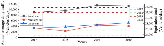 According to statistics from the transport sector, the traffic volume in the Haoshanyu tunnel has increased year by year, and the equivalent total traffic volume increasing from 23,550 vehicles per day in 2017 to 33,773 vehicles per day in 2020, as shown in Figure 3. With the increase of traffic flow, the noise pollution in the tunnel becomes more and more serious. Therefore, it is necessary to take noise reduction measures.