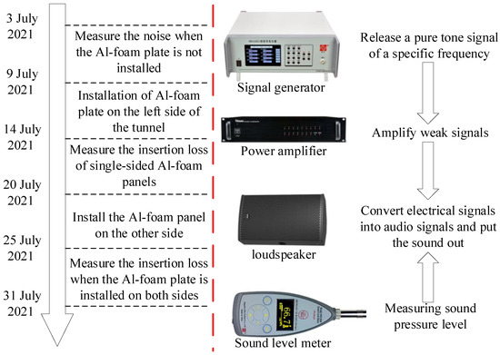This experiment was carried out following the installation progress of the aluminum foam boards in the tunnel. Repeated tests were carried out in three stages: before installation, one-sided installation was completed, and two-sided installation was completed. The details were shown in Figure 6. During the test, the power amplifier and loudspeaker were connected to the signal generator, and the loudspeaker was placed on the middle line of the tunnel at the central mileage of the tunnel to avoid the influence of the middle and short tunnel entrances as far as possible. Referring to the height of the car engine from the ground and set the height of the loudspeaker to 0.25 m from the ground. After the equipment is connected and placed, used a signal generator to release a 125 Hz octave pure tone signal, and adjusted the power amplifier so that the external sound can be heard clearly. At the same time, the setting value of the power amplifier was recorded, and the subsequent tests were based on this value. The pure tone signal was continuously released by the signal generator and placed outside the tunnel through the loudspeaker. After the sound was stable, the equivalent continuous A-weighted sound pressure level within 10S was measured by the sound level meter at the specified measuring point. Based on the requirements for the height of the sensor from the ground in the indoor measurement of noise-sensitive buildings and the requirements of the human ear for the height of noise acceptance, the height of the sound level meter from the ground was 1.2 m. Repeated the measurement for each measuring point 3 times, then changed the measuring point after the measurement was completed. After all measuring points were measured, stopped the signal generator from vibration. Finally, adjusted the frequency and restarted the vibration measurement.