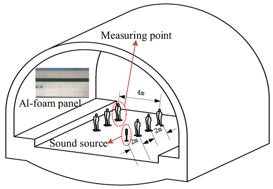 The groups affected by noise in the tunnel are mainly the staff at the shoulder of the road and the drivers in the car, so the measuring points were arranged at the center line of the tunnel and the shoulder of the road. In order to explore the distribution law of the sound absorption effect along the longitudinal direction of the tunnel, the measuring points were arranged at a longitudinal distance of 2 m, 4 m and 6 m from the sound source, as shown in Figure 7. This test was carried out following the installation progress of the aluminum foam boards in the tunnel. Repeated tests were carried out in three stages: before installation, one-sided installation is completed, and two-sided installation is completed. The detail can be seen in Figure 6.