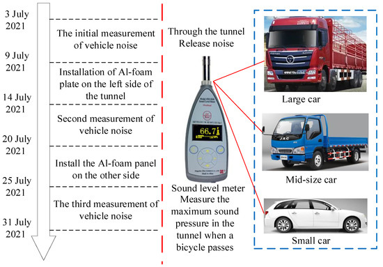 The test of Case II is similar to that of Case I. Following the installation progress of the aluminum foamed board, the test was also carried out in three stages before installation, one-sided installation is completed, and two-sided installation is completed, as shown in Figure 8. Before the test, the two lanes were blocked at 500 m from the entrance and only allowed to pass through the only lane, which can achieve the effect of limiting the speed of the vehicle and avoid some accidental noise interference caused by the lane change when the car is driving. During the test, turn on the continuous sampling function in the sound level meter when the vehicle enters the tunnel. The sampling interval of the sound level meter is 1S. When the vehicle exits the tunnel, stop sampling and read the maximum instantaneous A-weighted sound pressure level during the sampling period. For each vehicle type, at least 100 data samples were taken in each test, and the 100 data samples were divided into 10 groups evenly, and the average value of each group was calculated as the representative value of this group. Finally, the representative values were analyzed to explore the noise reduction law of closed-cell aluminum boards in tunnels.