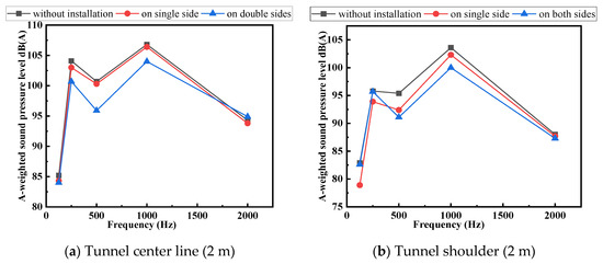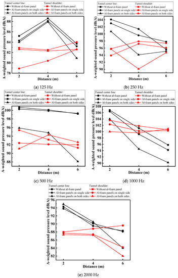 Figure 9a–e not only show the distribution law of the sound field inside the tunnel, but also show the sound absorption effect of closed-cell aluminum foam boards under different sound field positions and distances. On the whole, the sound pressure at the center line of the tunnel is slightly greater than that at the tunnel shoulder. This is because the sound source of the tunnel is arranged on the center line of the tunnel. The linear distance between the measuring point on the center line is larger than the measuring point at the shoulder of the same cross section, so the sound energy has a longer dissipation distance. In addition, it can be found that the farther away from the sound source, the smaller the sound pressure level measured no matter the measurement is on the centerline of the tunnel or the shoulder of the road. This is because the longer the distance, the more the sound energy is dissipated. However, there are special cases that do not conform to the general rules in the data points measured this time. For example, the equivalent continuous A-weighted sound pressure level measured at the measurement which is on the center line of the tunnel and 4 m away from the sound source at 125 Hz is obviously greater than the distance is 2 m and 6 m; the sound level measured at the shoulder 6 m longitudinal distance from the sound source at 1000 Hz is higher than that measured at the tunnel midline. This is because the pure tone signal released is a sine wave. The positive superposition of the amplitude of the reflected sound wave and the direct sound wave at these measuring points enhances the sound pressure level, while the superposition of the reflected acoustic wave and the direct acoustic wave at other locations is very weak or the superposition is reversed.