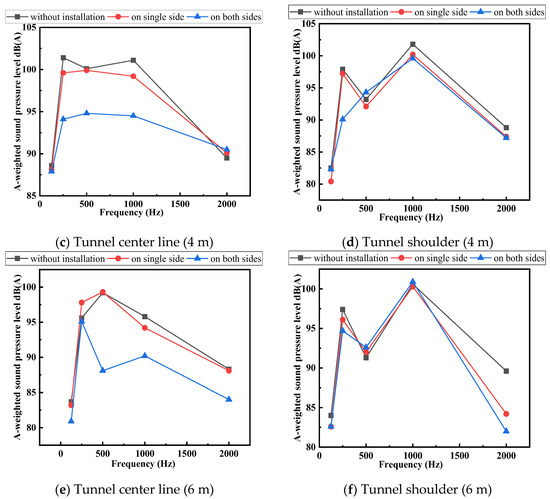 Figure 10a–f reveal the sound absorption performance of closed-cell aluminum foam boards for pure sounds at different frequencies. In general, the equivalent continuous A-weighted sound pressure level measured in the tunnel presents a M-shaped distribution, that is, the equivalent continuous A-weighted sound pressure level is higher at the frequency of 250 Hz and 1000 Hz, and the results measured at the frequency of 125 Hz and 2000 Hz are very low.