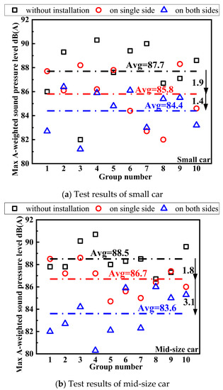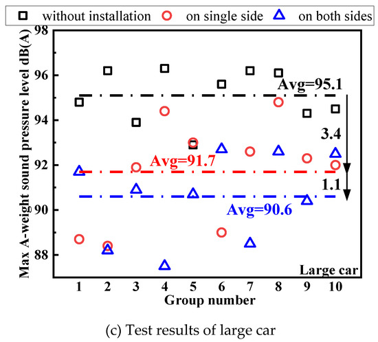 Case II mainly studies the sound absorption performance of closed-cell aluminum foam under moving sound sources. Analysis of the measurement results in Case II can more accurately reveal the noise reduction effect of closed-cell aluminum foam boards on vehicle noise in tunnels. Since the impact of the vehicle model on the noise generated was considered in the test, when analyzing the possible noise reduction effect of closed-cell aluminum foam in tunnel applications, the analysis was carried out according to the three common vehicle models in the tunnel, as shown in Figure 11a–c.