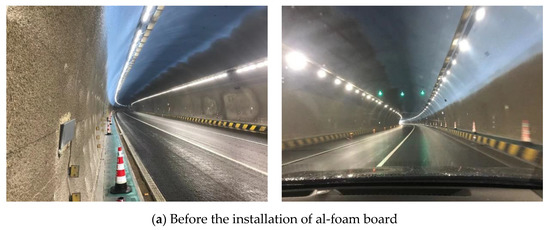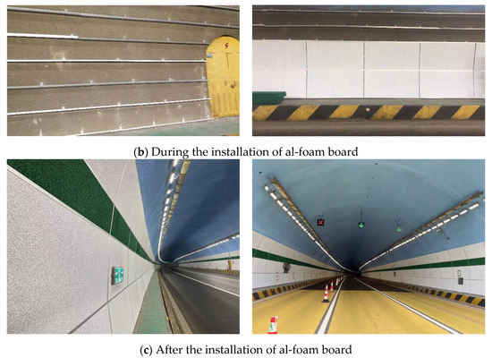 Closed-cell aluminum foam is a kind of material with both fire prevention and sound absorption and noise reduction functions. The Haoshanyu Tunnel on the Qinglan Expressway has become the first expressway tunnel in China to complete the whole line laying of aluminum foam board due to the needs of noise reduction and fire prevention improvement. The field performance of closed-cell aluminum foam board in the tunnel before installation, during installation and after installation were shown in Figure 12. Before the installation, the concrete on both side walls of the tunnel lacked fire protection treatment, which can be seen from the on-site photos before installation. According to the relevant regulations in China’s “Code for Fire Protection of Building Design” GB 50016-2014, it is known that the interior decoration in the tunnel should be made of non-combustible materials, and the temperature of the concrete surface should not exceed 380 °C. The closed-cell aluminum foam has a good effective thermal conductivity at high temperatures [27], and its installation in the tunnel perfectly compensates for the lack of fire protection and meets the national fire protection standards.