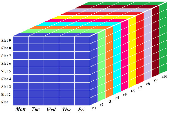 Three-dimensional table of schedules assigned to various rooms (r1 to r10).