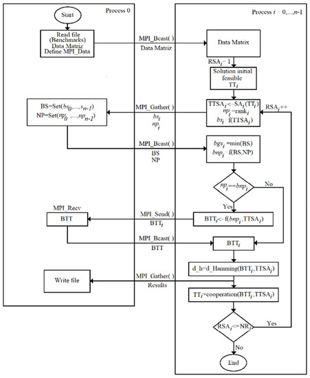 - At the end of each process i in SA a solution optimized TTSAi is obtained and collected in process i = 0 through each process i. The best solution bsi = f(TTSAi) obtained by the cost function (Equation (1)) in SA, through an arrangement of best solutions, BS = Set (bs0, …, bsn-1) and also the number of process npi = ranki that corresponds to the bsi solution by means of a number of processes array, NP = Set(np0, …, npn−1). Collective communication with MPI_Gather is applied to send the best cost value bsi (best solution) of each process i, to the process i = 0 and thus obtain the BS array located in process i = 0.