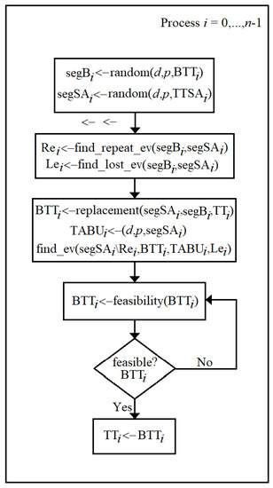 - To return the feasibility in BTTi <− feasibility (BTTi), repeated events Rei <− find_repeat_ev (segBi, segSAi), presented in the segments of replacement segSAi and segBi are searched. In the example in Figure 4c,d, the event Rei = {2} appears as repeated, and this indicates that event 2 will not appear repeated in the new BTTi solution (Figure 4e).