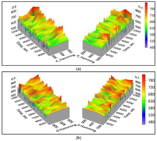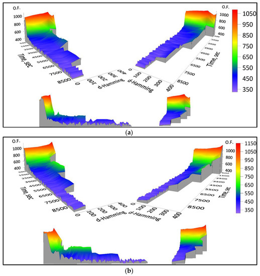 In order to know if there are significant differences in the behavior of the objetive function values obtained by the algorithms, it is required to analyze the results obtained by the six algorithms. As there are not both assumptions of normality and homoscedasticity of the data provided by the six algorithms, and also because the number of data analyzed by each algorithm is small, Kruskal–Wallis non-parametric method, proposed by William Henry Kruskal and Whallen Wallis [45], will be applied. The Kruskal–Wallis test requires that the observations of each algorithm, which must be different, be presented in ranges. The Equation (16) presents the Kruskal–Wallis test. If there are observations with equal values, then Equation (16) is divided by the relation (17), where H is the value of the contrast statistic, C is the number of the algorithms to analyze (in this case there are six algorithms), ni is the number of observations in the ith algorithm (number of results of each algorithm), N = ∑ni is the total number of results of all algorithms and Ri is the sum of the ranges in the ith algorithm.