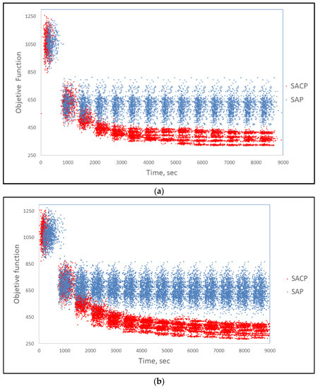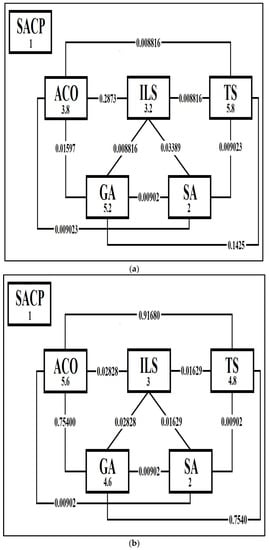 Figure 14 presents the p-values in pairs of algorithms that were compared with SACP for small and medium instances. Figure 14a presents the p-values between a pair of algorithms that were compared with SACP for small instances. It is observed that among eight pairs of them, there is also a difference in the effects of the types of algorithms by having a lower p-value at its significance level, such as ACO vs. TS, ACO vs. SA, ACO vs. GA, ILS vs. TS, ILS vs. SA, ILS. However, also between two pairs of them, there are no differences in the effects of the types of algorithms, as these have a p-value greater than their level of significance, such as ACO vs. ILS with a p-value of 0.2873 and GA vs. TS with a p-value of 0.1425.